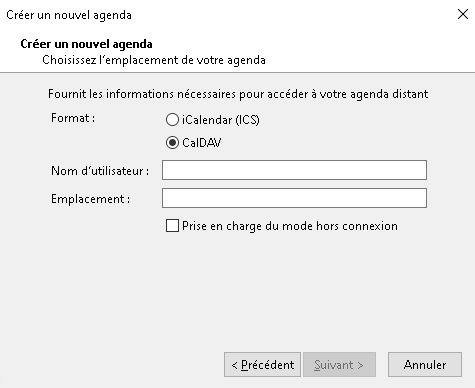 - Cliquez sur “suivant”, puis choississez le format CalDAV, laissez le nom d'utilisateur vide, complétez le champ “Emplacement” avec le lien CalDAV récupéré juste avant, et décochez la case “Prise en charge du mode hors connexion”