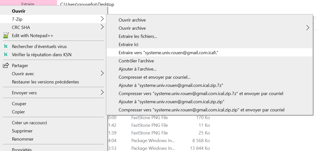 - décompressez le fichier pour récupérer le fichier .ics : clic droit sur le fichier zip, puis cliquez sur “extraire vers nomdudossier” :